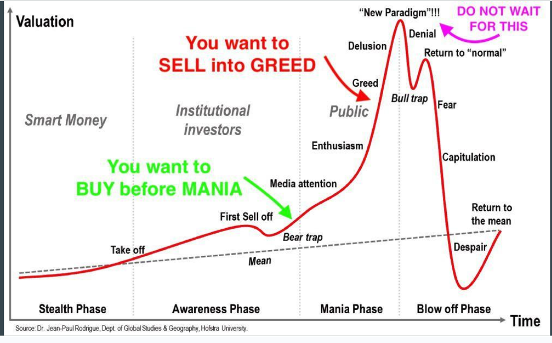 Markets move in cycles driven by investor psychology. Early adopters (smart money) accumulate during periods of low attention, followed by broader institutional and retail participation, and finally, a euphoric blow-off top.