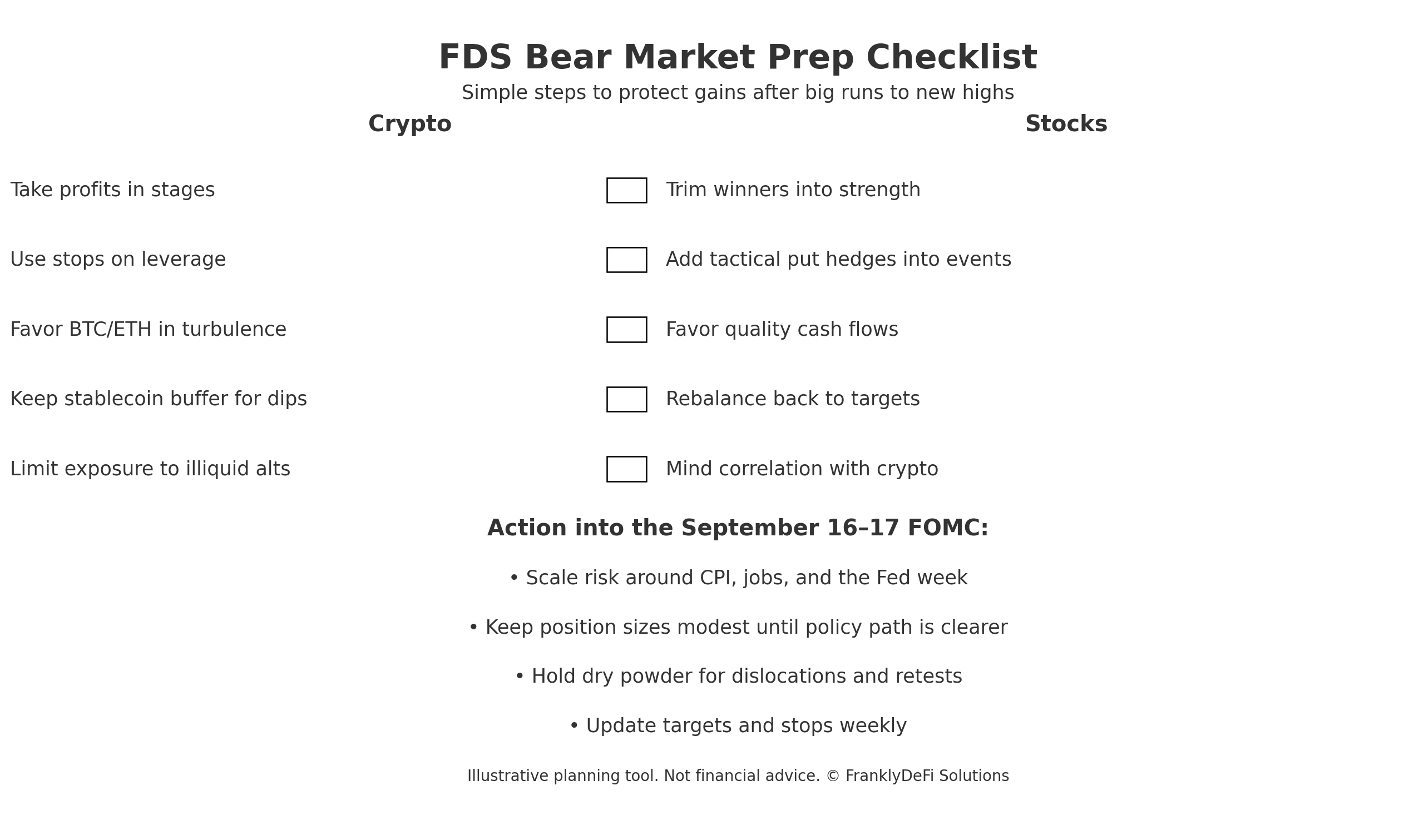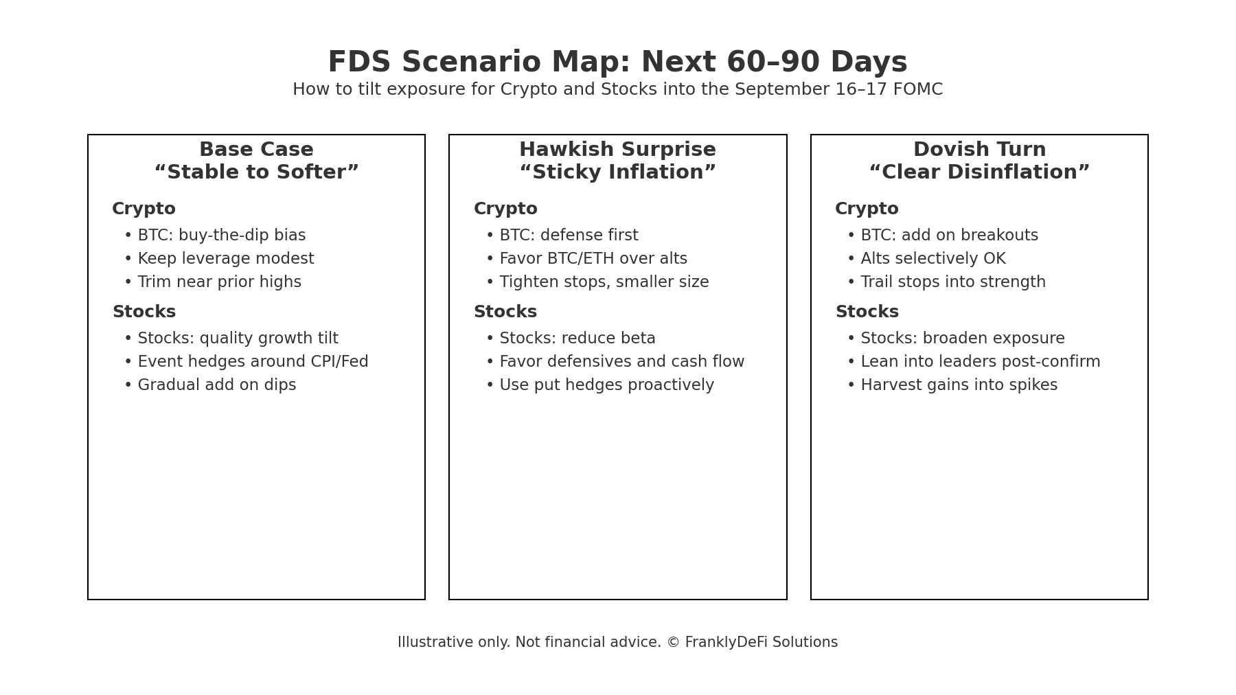 Reduce risk or add hedges into major data prints and the Fed week. Re-add risk when the message is clear.